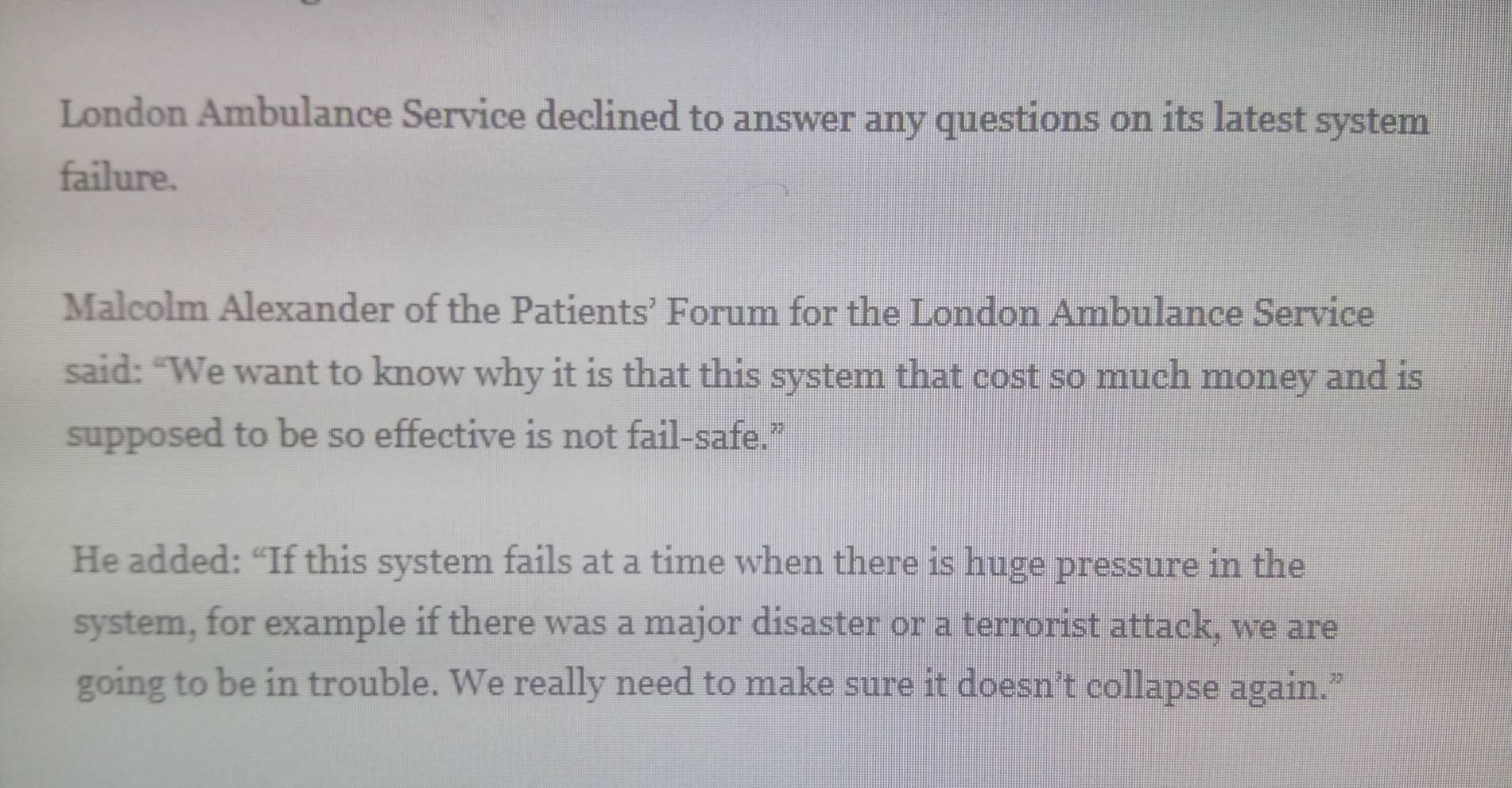 Το προσωπικό έπρεπε πάλι χειροκίνητα να ελέγξει την κατάσταση λόγο της αποτυχίας του συστήματος παρακολούθησης μέσω διαδικτύου και των αυτοματοποιημένων δορυφορικών συστημάτων πλοήγησης για τα πληρώματα ασθενοφόρων.